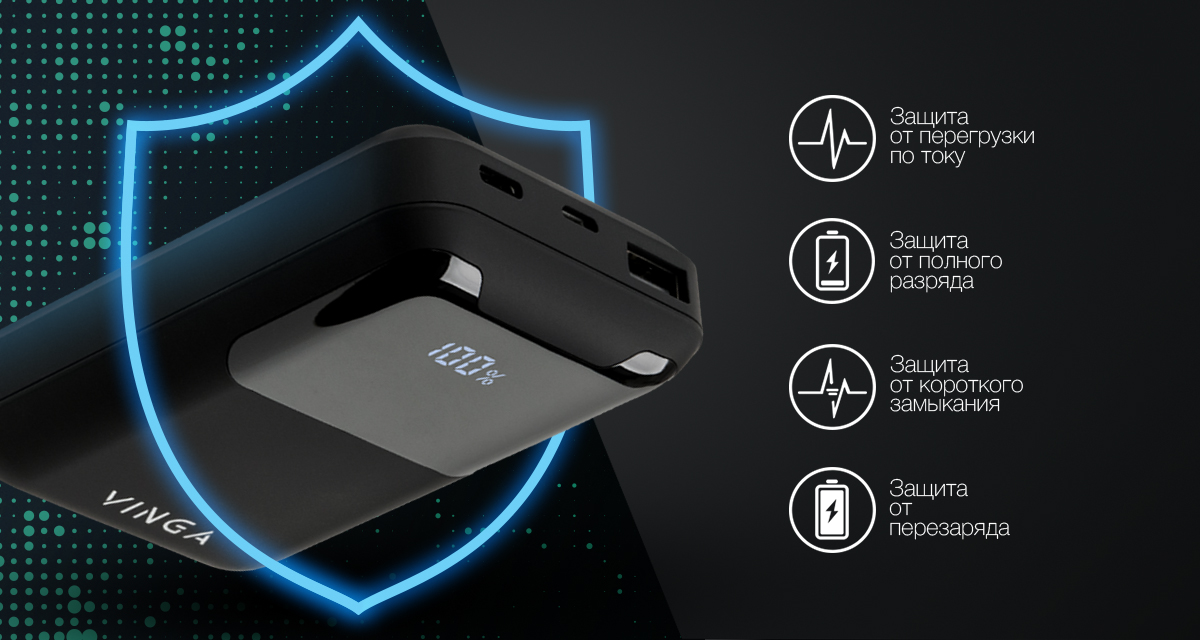 С универсальной батареей Vinga можно не волноваться ни за устройства, которые вы будете заряжать, ни за сам павербанк. В него аппаратно встроена защита от короткого замыкания, защита от перезаряда, защита от полного разряда и защита от перегрузки по току.