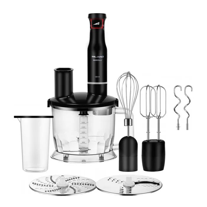 Особенно стоит отметить комплектацию, включающую разнообразные насадки и аксессуары. Насадка-венчик, нож для измельчения, насадка-блендер и насадка для теста делают этот прибор действительно универсальным. Дополнительные емкости — мерный стакан объемом 0.6 литра и большой мини-измельчитель на 860 мл — позволяют готовить порции разного объема. Это одна из причин выбрать именно Milano BL-2011B для большой семьи или приготовления праздничных блюд.