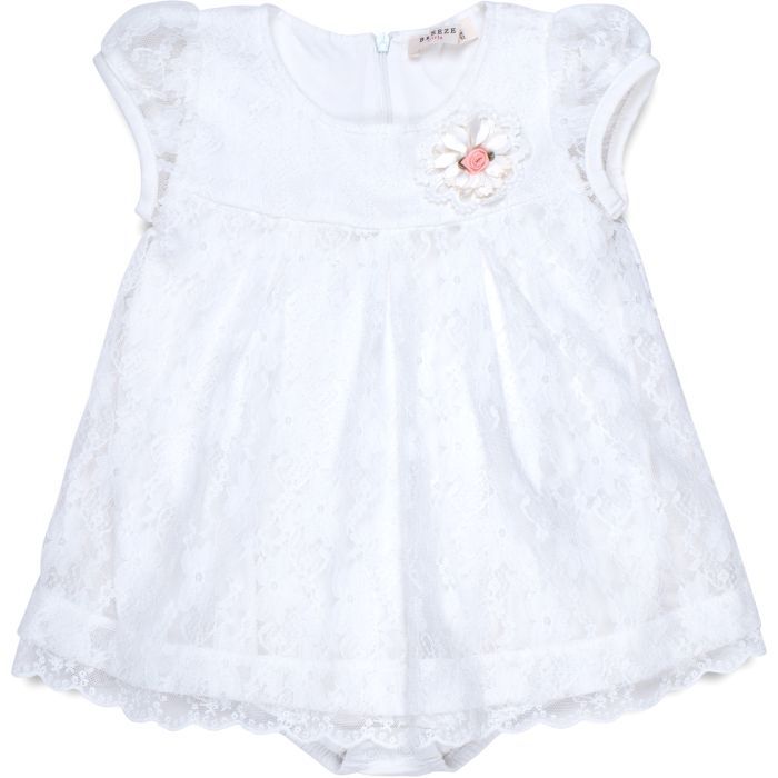 Кружевное трикотажное боди-платье с цветочным декором для девочки.