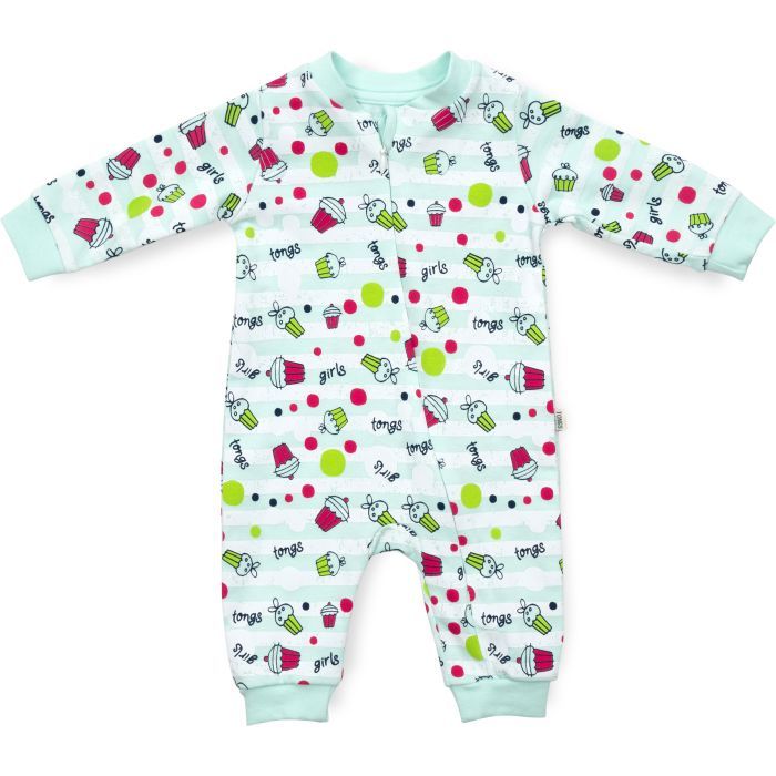 Цветовая основа человечка светло - мятного цвета, в белую полосочку. По всей поверхности украшен надписями, разноцветными кружочками и капкейками. Ткань очень мягкая, приятная на ощупь. Застёгивается на потайную молнию с лёгким ходом. Вверху есть защита для подбородка. Молния начинается от центра горловины и спускается вниз к левой ножке. Ножки не зашиты, с трикотажными манжетами на щиколотках. Такой комбинезон ступни не прикрывает, но зато сможет служить дольше (по мере роста малыша). Горловина и края рукавов обработаны мягкой трикотажной резинкой.