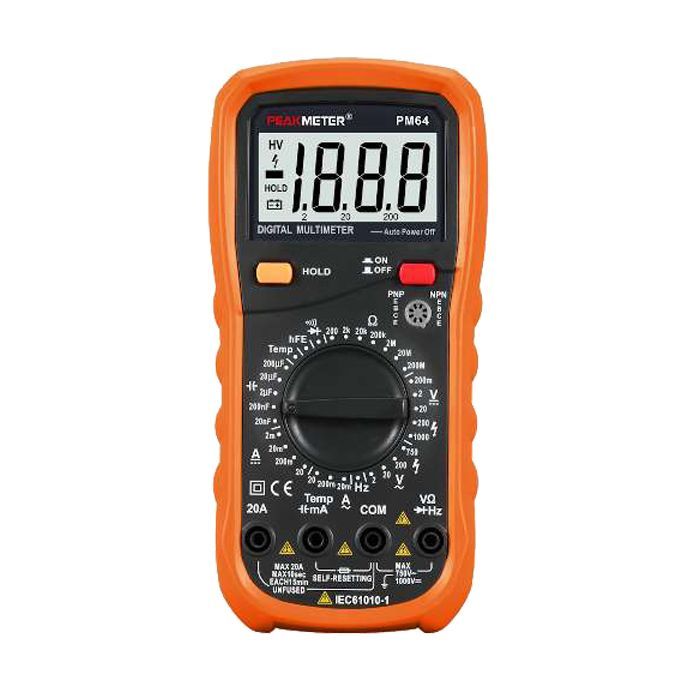 На передней панели расположен большой ЖК-дисплей, обеспечивающий четкое отображение показаний, а интуитивно понятный ручной переключатель позволяет легко менять режимы измерения. Устройство поддерживает тестирование диодов и транзисторов, что расширяет его функциональные возможности. Защитная схема позволяет прибору не скользить в руках во время работы.