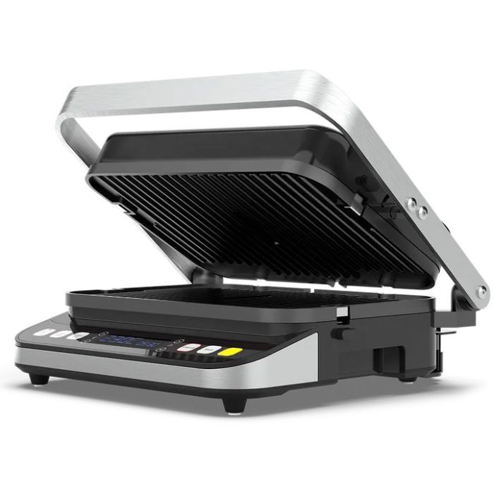 Устройство отличается эргономичным дизайном, включающим компактный настольный формат, идеально подходящий для любой кухни. Его ребристая рабочая поверхность оснащена антипригарным покрытием, которое предотвращает прилипание пищи и делает процесс очистки чрезвычайно простым. Удобные съемные пластины можно мыть в посудомоечной машине, что позволяет быстро подготовить гриль к следующему использованию.