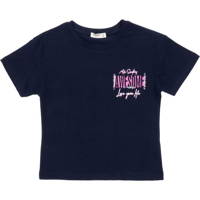 - Летняя стильная трикотажная темно-синяя футболочка для девочки из качественного нежного турецкого трикотажа, украшена эффектным, ярким, цветным, положительным принтовым рисунком с глиттерными деталями спереди и на спинке.