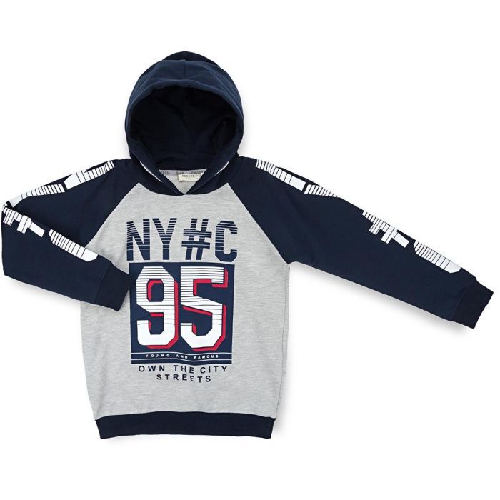 Удобная, не сковывающая движения, двухцветная спортивная кофта - худи из натурального хлопка с капюшоном . Капюшон двойной, на трикотажной подкладке. Шнурок в капюшоне декоративный. Манжеты на рукавах и по низу худи – из качественной двойной трикотажной «резинки». Украшена спереди объёмным контрастным принтом в виде надписей и цифры «95». Так же принтованными надписями украшены рукава худи.