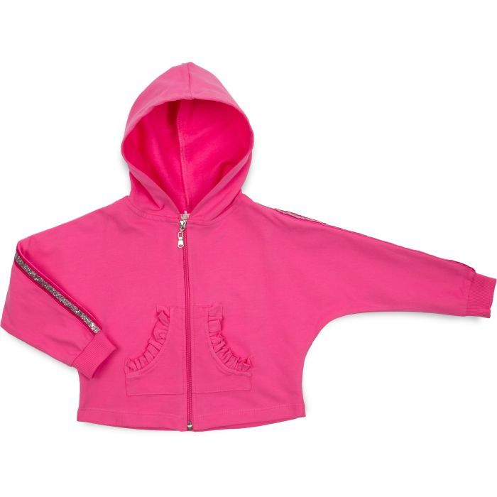 Застёгивается на качественную капроновую молнию с металлическим бегунком. Капюшон одинарный. Рукава цельнокроеные на манжетах из эластичной, двойной трикотажной резинки отличного качества. Украшены эффектными блестящими серебристыми вертикальными лампасами. Манжеты рукавов Спереди выполнены накладные скошенные карманы. Вход в карманы украшен присобранным трикотажным рюшем.