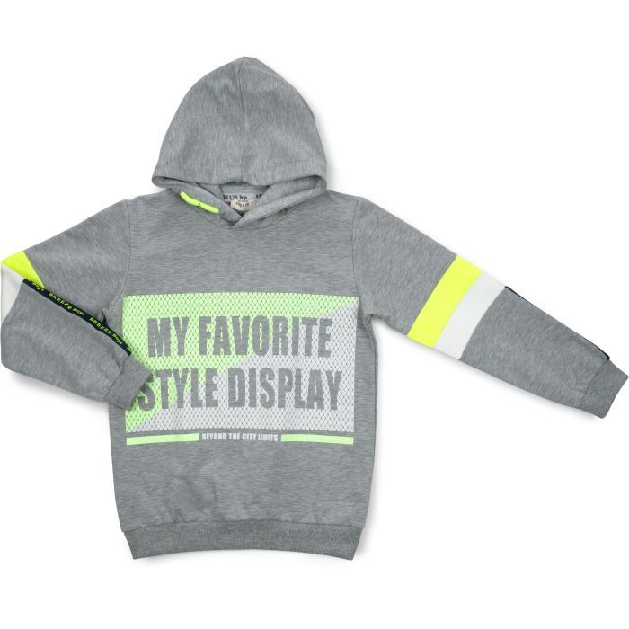 Удобная, не сковывающая движения, меланжевая спортивная кофта - худи с капюшоном, приятного светло-серого цвета, украшенная ярким объёмным принтом в неоново-салатовом и белом цвете.