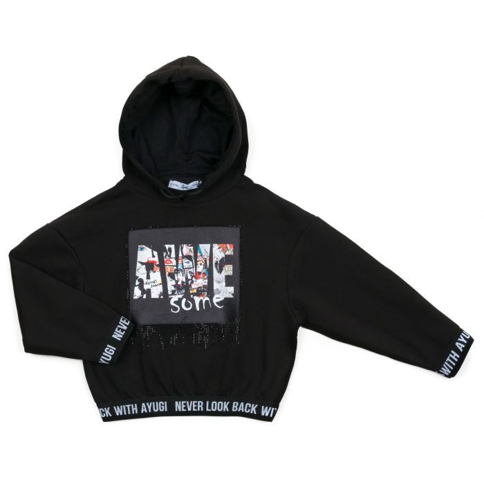Модная, трикотажная толстовка с капюшоном (худи) гладко-чёрного цвета, украшенная объёмной красочной атласной аппликацией, в окружении блестящих мелких чёрных страз – Must-Have для каждой модной и стильной девчонки!