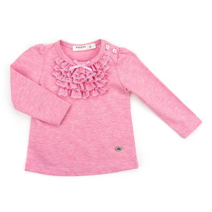 Нарядная модель, приятная на ощупь, спереди украшена красивыми, настроченными в пять рядов, кружевными рюшами в тон лонгслива (кружево – шитьё) и милым атласным бантиком по центру горловины. Рукав длинный, присборенный по окату. Эластичная круглая горловина, оформленная нежной трикотажной бейкой, мягкий трикотаж и застежка на левом плече на две фирменные пуговички облегчат процесс надевания. Для дополнительного украшения модели, в левом нижнем углу пришит серебристый логотип фирмы « BREEZE» в окружении кристалликов.