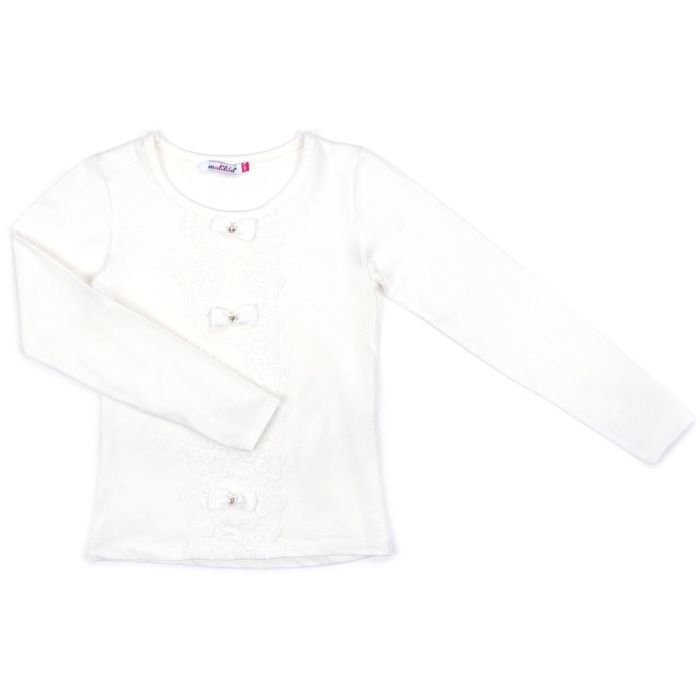 Замечательный лонгслив прямого силуэта, из мягкого, качественного, турецкого хлопкового трикотажа, с добавлением небольшого % эластана для поддержания формы. Спереди украшен красивым кружевом, настроченным поверх трикотажного лонгслива – кружевной цветочный мотив, вышитый матовыми нитками на евросетке. Дополнительным украшением служат милые атласные бантики, в серединке которых расположились красивые пуговички из ярких кристаллов. Вырез горловины классический, круглый, обработан мягкой трикотажной бейкой. Рукава длинные, без манжет.