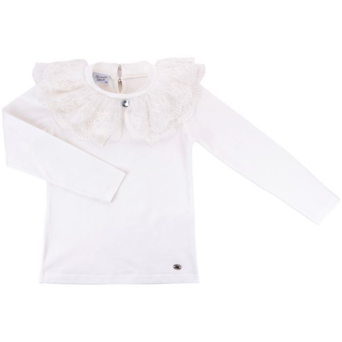 Эффектная модная модель прямого силуэта с длинным рукавом, из мягкого, качественного, турецкого хлопкового трикотажа, с добавлением небольшого % эластана для сохранения формы изделия после стирки. Верхняя часть переда украшена двумя рядами кружевных рюшей. Орнамент кружева в виде нежного цветочного мотива выполнен хлопчатобумажными нитками на мягкой евросетке. Воротник-стойка сзади застёгивается на две серебристые пуговки с камушком в центре. Для удобства при одевании от застёжки выполнен каплевидный аккуратный разрез.