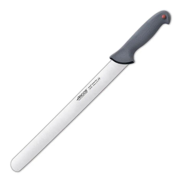 Нож серии «Сolour-prof» Arcos за счет длинного и гибкого лезвия предназначен для аккуратной срезки тонких кусков окорока. Можно использовать как нож для шаурмы. Серию профессиональных ножей Arcos Solour-prof разработали для интенсивного использования на кухнях ресторанов и пищевых производств.