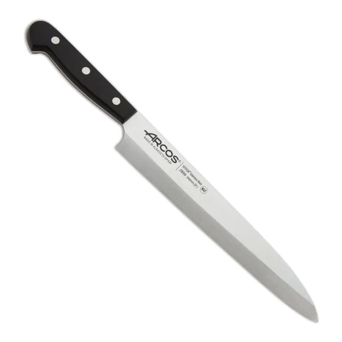 Нож японский Arcos серии "Universal" используют для тонкой слайсерной нарезки. Нож для суши "янагиба" в переводе означает "лист ивы" за визуальное сходство с листьями этого дерева.