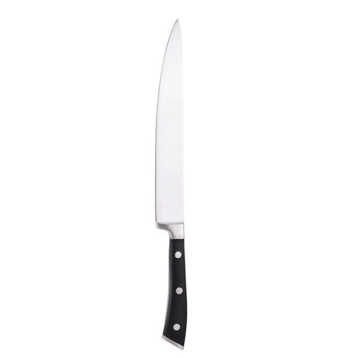 Эргономичная ручка удобной формы на металлических заклепках. Выгнутая ручка с упором под пальцы препятствует скольжению руки при работе с жирными продуктами. Серия кухонных ножей Bergner Master Pro Stuttgart легко справится с любой задачей.