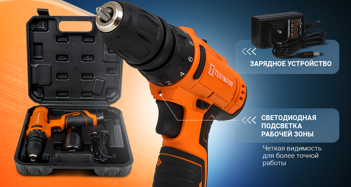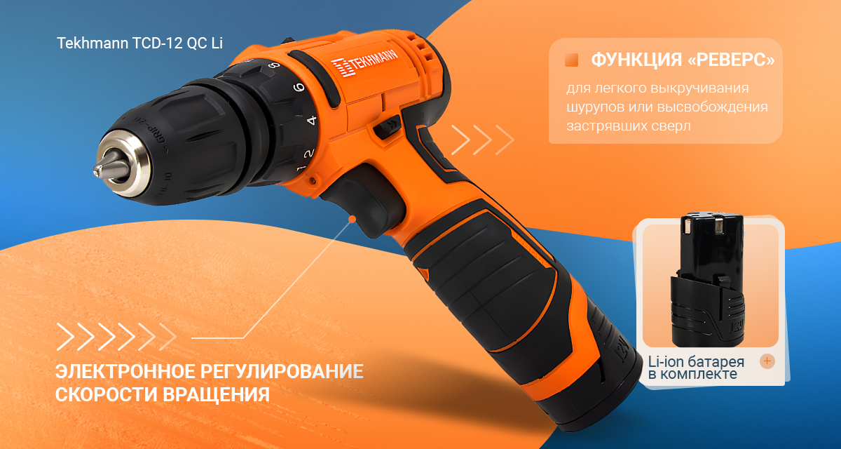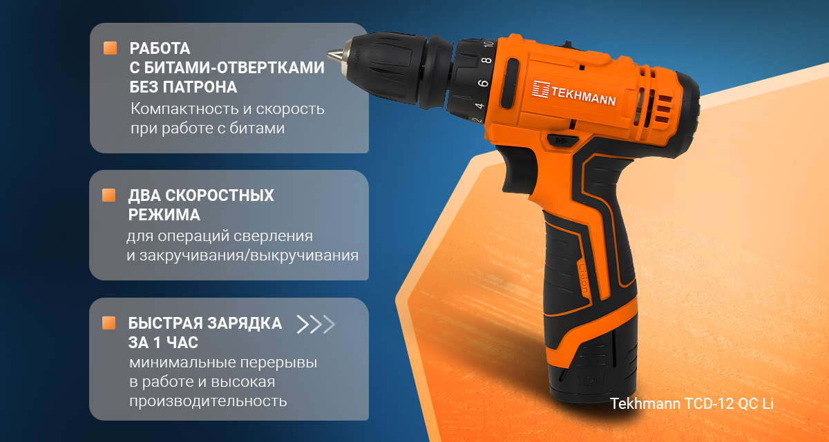 Описание Шуруповерт Tekhmann TCD-12 QC Li с 1 АКБ (853461)