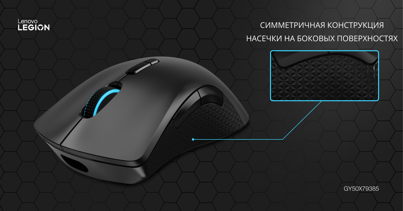 Мышь подходит для длительных и требовательных к ресурсам игровых сессий. Симметричная конструкция удобна для правшей и левшей. Неважно как ты держишь Lenovo Legion M600 Wireless Gaming Mouse во время игры - только пальцами или всей рукой, - аксессуар удобен в пользовании в любом из этих положений. Насечки на боковых поверхностях обеспечат надежный захват.