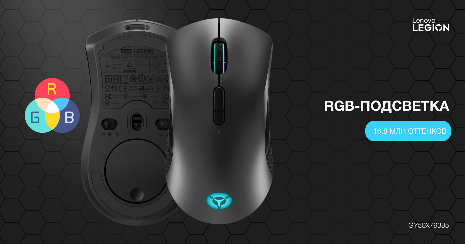 Legion M600 Wireless Gaming Mouse оснащена RGB-подсветкой. Две независимо настраиваемые зоны могут переливаться 16,8 млн. оттенков. Такое сопровождение сделает кибербаталию динамичной и эмоциональной.
