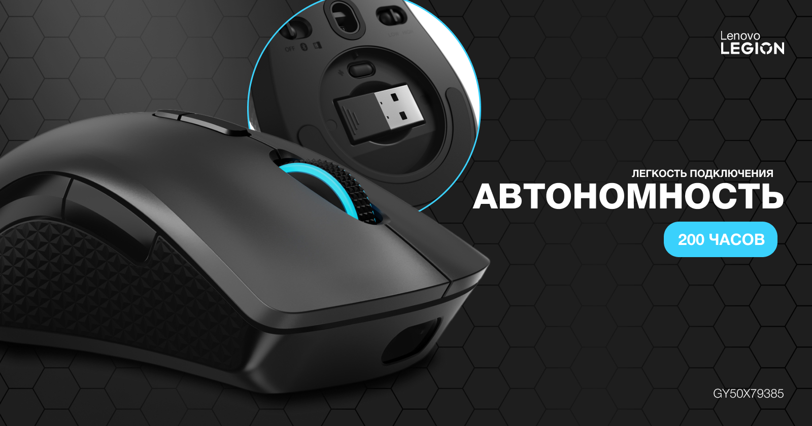 Мышь синхронизируется с ноутбуком, ПК или моноблоком с помощью приемника 2,4 ГГц и Bluetooth-адаптера. Аксессуар можно подключить с помощью USB-порта. Lenovo Legion M600 работает до 200 часов на одном заряде. За 2,5 часа аккумулятор заряжается с 0 до 100%. Мышь поддерживает опцию быстрой зарядки - десяти минут хватит на десять часов гейминга. Выбери эту беспроводную мышь, чтобы оценить превосходную производительность, продуманную эргономику и современный дизайн!