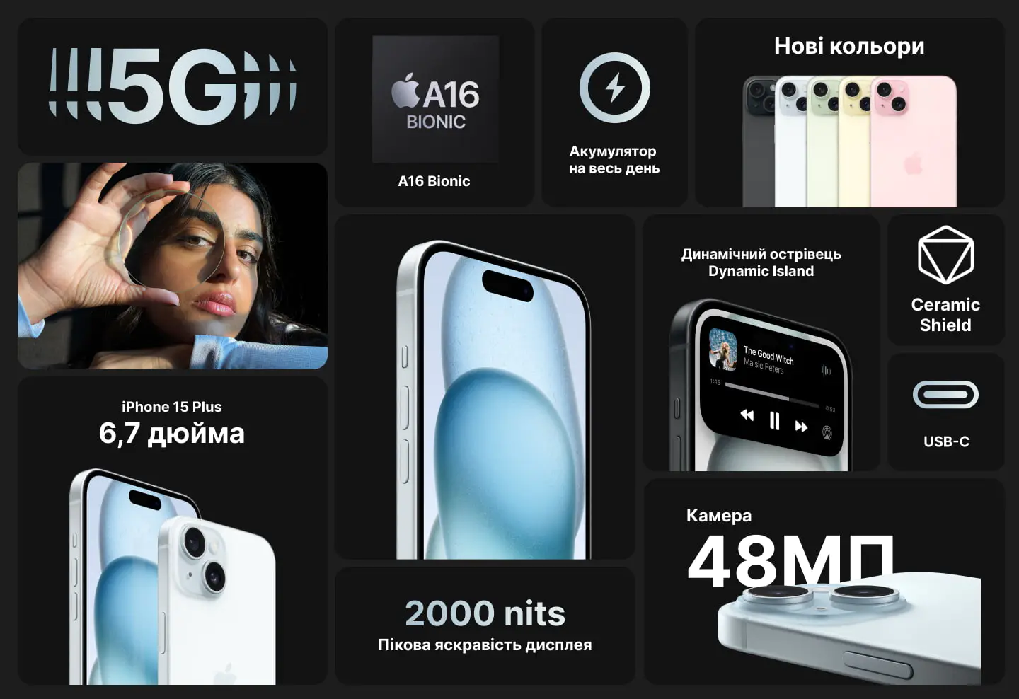 iPhone 15 Plus оснащен прочным корпусом из стекла и алюминия. Он защищен от брызг, воды и пыли. А передняя панель Ceramic Shield прочнее стекла любого смартфона. Кроме того, дисплей Super Retina XDR 6,7 дюйма обеспечивает почти вдвое большую яркость на солнце, по сравнению с iPhone 14 Plus.