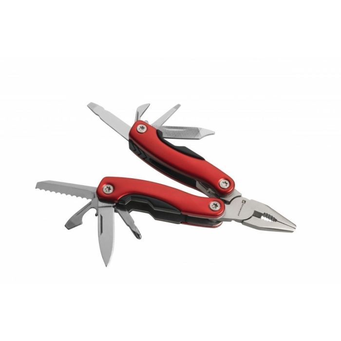 Мультитул оснащён 13 необходимыми инструментами, среди которых есть нож, консервный нож, плоскогубцы, напильник, шило, отвёртка плоская и крестовая, пила, открывалка для бутылок и пилка для ногтей. Все они изготовлены из высококачественной нержавеющей стали, обеспечивая долговечность и устойчивость к коррозии, а также надёжную защиту от механических повреждений.