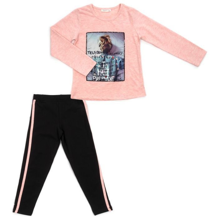 Яркий симпатичный лонгслив прямого силуэта, чуть расширен к низу, с длинными рукавами, украшен стильной атласной фото-картинкой с очень эффектным сияющим декором, в обрамлении пришитых мелких чёрных пайеток, без сомнений понравится вашей моднице, Горловина овальная, обработана эластичной трикотажной бейкой. Удобные лосины с эластичным поясом на резинке, обеспечат оптимальную посадку по фигуре. По бокам штанины украшены трикотажными лампасами персикового цвета.