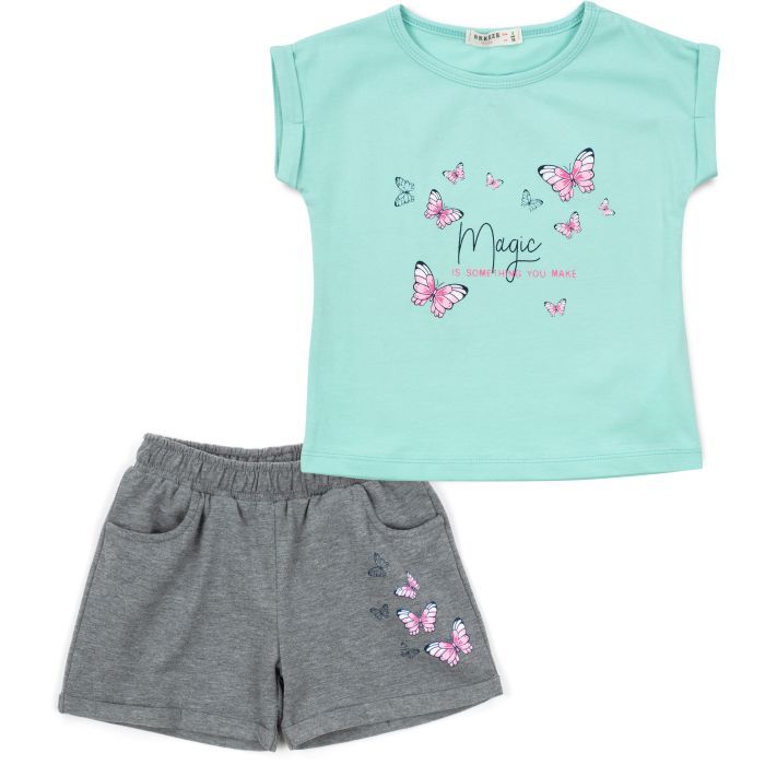 - Симпатичный трикотажный комплект для девочки из тонкого хлопкового (90% хлопок) турецкого трикотажа, гладкого, очень качественного и приятного на ощупь: мятная футболочка и серые шортики.