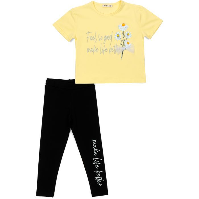 - Очень милый, симпатичный летний комплект для девочки: тепло-желтая футболочка и гладко-черные лосины.