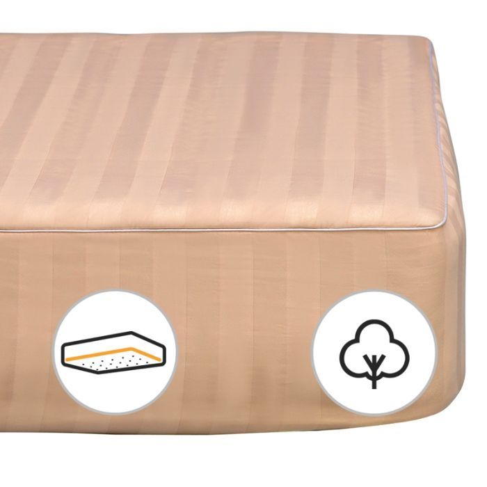 Наматрасник на резинке с высококачественной итальянской ткани. Ткань имеет название "Сатин-страйп Италия" которая долговечна, состоит исключительно со 100% высококачественного хлопкового волокна. Сатиновая ткань чехла имеет сложное, жаккардовое переплетение, что придает наматраснику не только высоко эстетическую изысканность, но и увеличивает прочность ткани в целом.