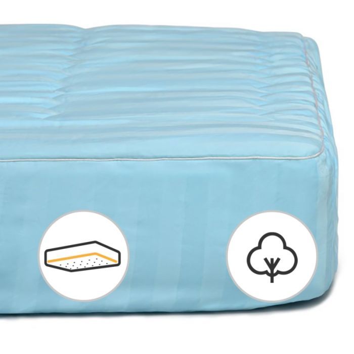 Наматрасник на резинке с высококачественной итальянской ткани класса "Premium". Ткань имеет название "Сатин-страйп Италия", которая долговечна, состоит исключительно со 100% высококачественного хлопкового волокна. Сатиновая ткань чехла имеет сложное, жаккардовое переплетение, что придает наматраснику не только высоко эстетическую изысканность, но и увеличивает прочность ткани в целом.