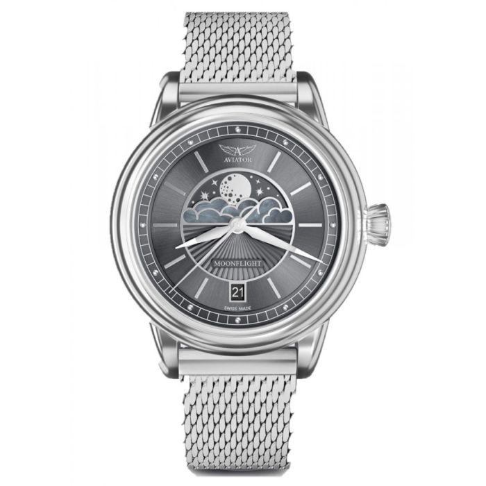 Циферблат представляет собой высшее достижение стиля и философии ар-деко. Текстура в виде солнечных лучей, металлические часовые метки отполированые с помощью алмаза и настоящий перламутр придают мягкость и загадочность четкому и решительному дизайну. Особое внимание привлекает самый заметный элемент циферблата – диск с фазами Луны, обрамленный облаками и гильошированными узорами, а также исчезающие за горизонтом трехмерные элементы. Выделяются нанесенные на минутной шкале «заклепки», отсылающие к самолетам «золотого века» авиации. Если присмотреться к Луне, все самое интересное – в деталях. Отделанные настоящим перламутром облака служат апертурой для показателей лунных фаз и отсылают наше воображение к строгой классике модных в 1930-е годы жемчужных ожерелий, добавляя прелесть старины этой вневременной модели. Переливы и отражения на перламутровой поверхности напоминают лунный свет. Посмотрите, как он играет, отражаясь на облаках и усыпанном звездами небе. Каждая из восьми фаз Луны влияет на режим сна, состояние умов, провоцирует приливы и отливы. С часами AVIATOR MoonFlight на запястье вы сможете отслеживать смену лунных фаз на протяжении всего лунного цикла (он длится 29,5 суток) и поминутно наблюдать, как они сказываются на вашем состоянии.