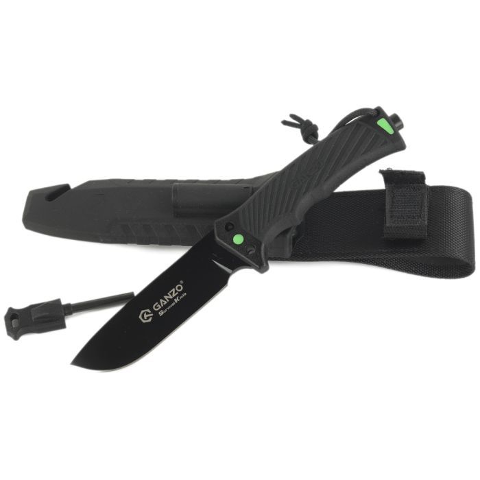 Комплектация Ganzo G8012V2-OR включает в себя функциональные ножны, которые несут сразу несколько дополнительных функций. Помимо надежного хранения клинка, в них встроены кресало для разжигания огня, стропорез и точилка для постоянного поддержания остроты лезвия. Темляк из паракорда позволяет удобно носить нож на поясе или закреплять на снаряжении.