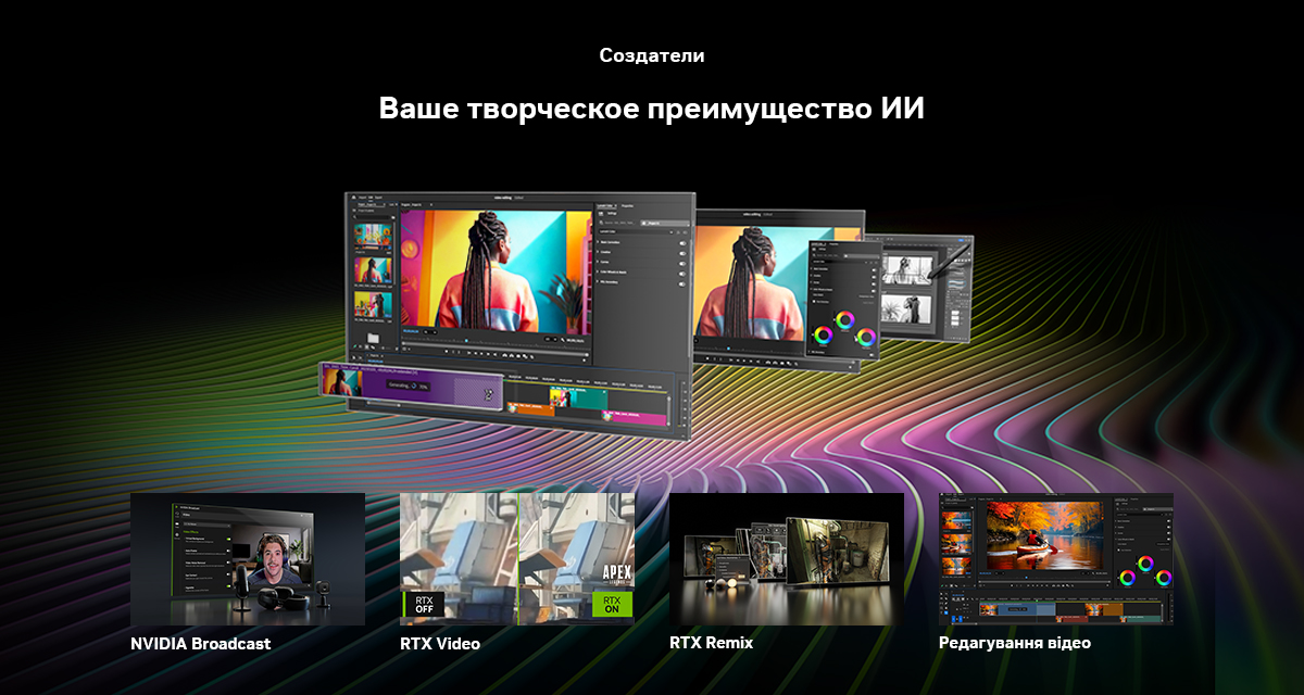 NVIDIA Studio — ваше творческое преимущество. Графические процессоры серии GeForce RTX 50 обеспечивают трансформационную производительность в редактировании видео, 3D-рендеринге и графическом дизайне. Ощутите ускорение RTX в лучших творческих программах, используйте драйверы NVIDIA Studio высочайшего уровня, которые постоянно разрабатываются и обновляются для обеспечения максимальной стабильности, а также воспользуйтесь набором эксклюзивных инструментов, которые используют мощь RTX с ИИ для творческих рабочих процессов.