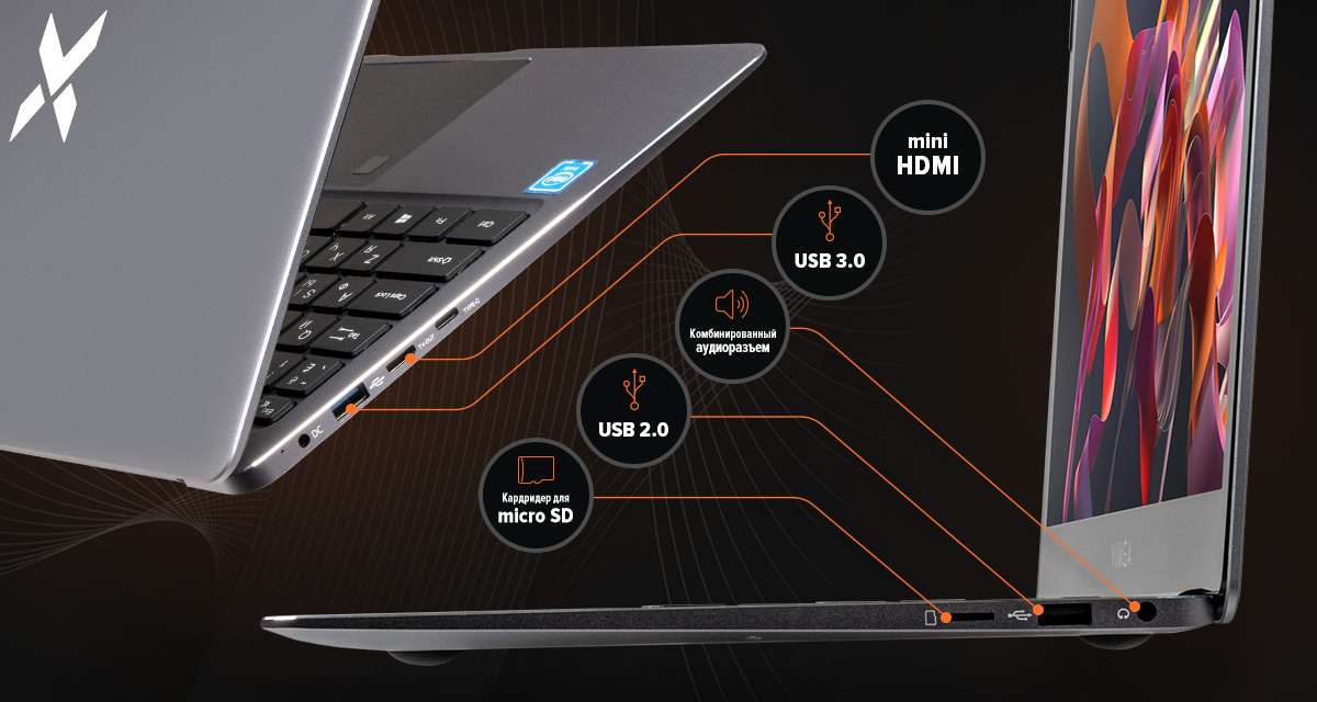Ноутбук отлично подготовлен для совместной работы с периферийными устройствами и аксессуарами. В корпусе есть порты USB (2.0 и 3.0), комбинированный аудио-разъем, порт для быстрой зарядки usb 3.1 type c, miniHDMI для подключения к монитору или телевизору и слот для карт micro-SD.