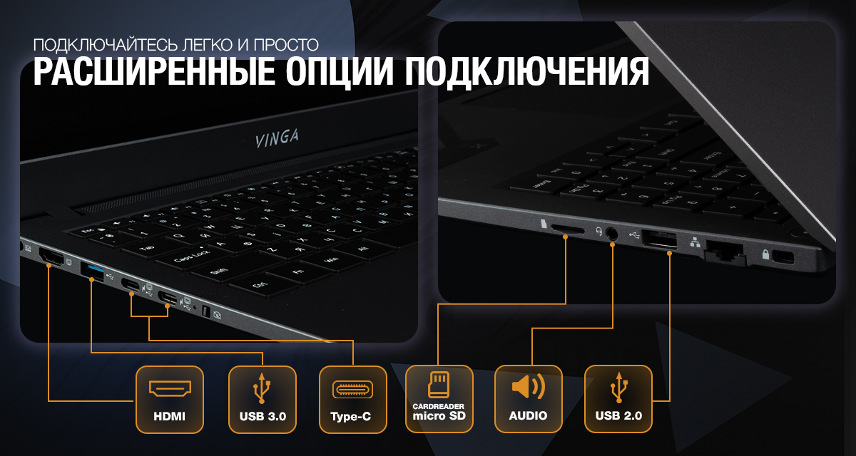 Ноутбук Vinga Iron S150 - это не только мощный, но и удобный. В корпусе расположены порты USB (2.0 и 3.0), комбинированный аудио-разъем, порт для быстрой зарядки USB 3.1 type C, HDMI для удобного подключения к монитору или телевизору, а также слот для карт micro-SD. Обеспечьте себе все необходимое для эффективной работы и развлечений в одном стильном устройстве.