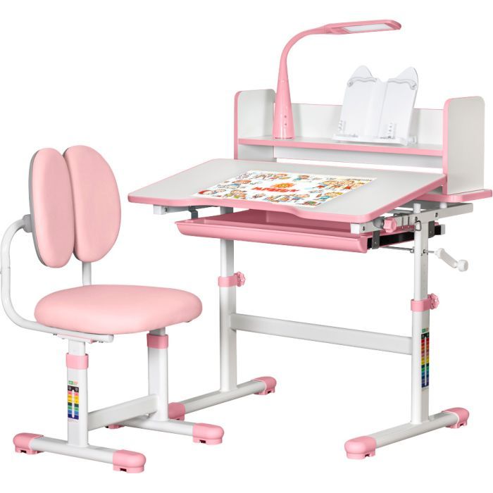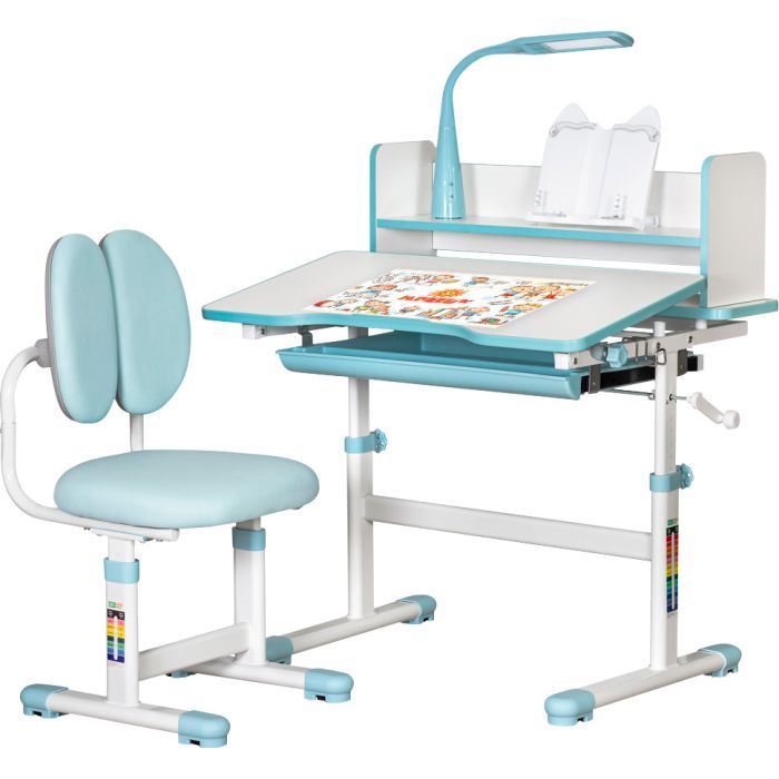Основное преимущество парты — это возможность регулировки высоты стула и столешницы. Благодаря плавному механизму, парта легко подстраивается под рост ребенка, диапазон регулировки составляет 53-72 см. Это гарантирует максимально удобное использование на протяжении многих лет. Наклонные столешницы до 40° с прочными фиксаторами превращают парту в мольберт для рисования.
