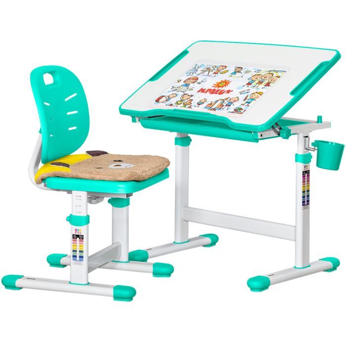 Стул комплекта изготовлен из безопасного ABS-пластика и имеет прочную металлическую конструкцию, способную выдержать до 40 кг постоянной нагрузки. Стул также регулируется по высоте и глубине, чтобы наиболее подходить для вашего ребенка.