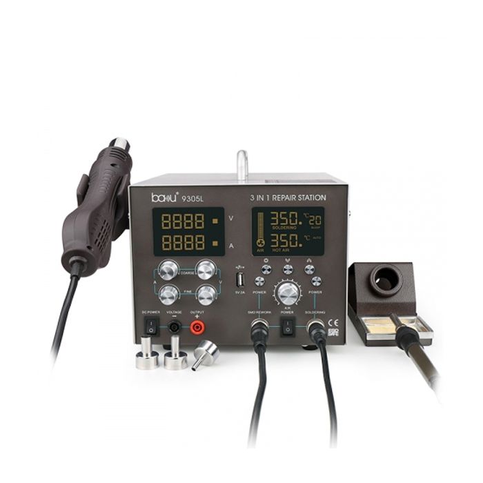 Тип - Настольный, Вид - паяльник+фен, Тип нагнетателя - турбинный, 900 Вт, Особенности - цифровая индикация, насадки для термофена, подставка для фена, губка для пайки, подставка для паяльника