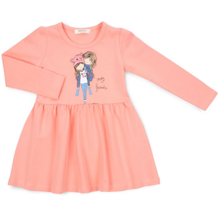 - Симпатичное персиковое трикотажное платье с длинными рукавами, украшенное цветным принтовым рисунком девочек-подружек.