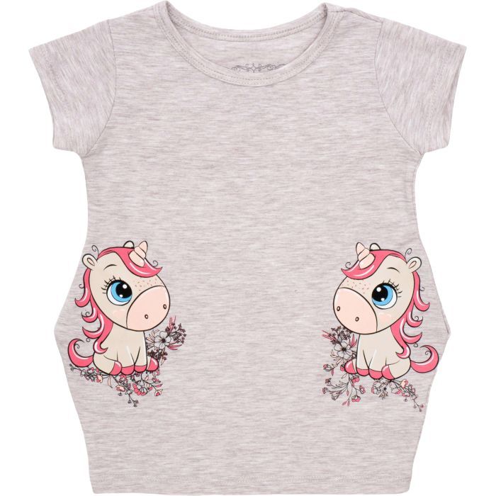 - Симпатичное, комфортное меланжевое трикотажное платье-туника бежевого цвета, с короткими рукавами, украшенное цветными принтовыми рисунками двух симпатичных единорожков спереди, в районе карманов, которое без всяких сомнений понравится вашей дочери.