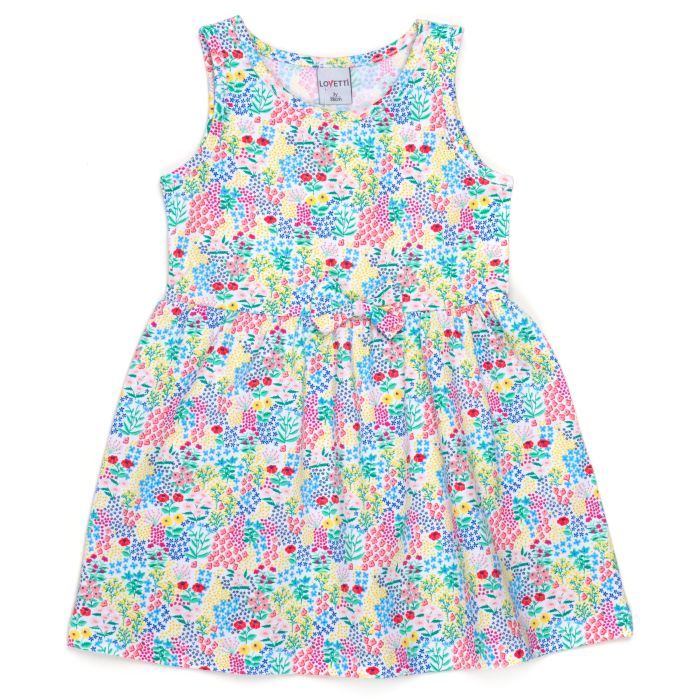 - Прекрасное, легкое цветное трикотажное платье-сарафан без рукавов, с невероятно положительным приятным цветочным узором – отличный летний вариант для вашей доченьки в жаркую летнюю погоду.