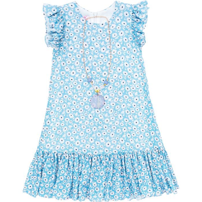 - Элегантное, хорошенькое легкое шифоновое платье голубого цвета в симпатичные беленькие цветочки с очаровательным украшением на золотистой цепочке для вашей красотки.