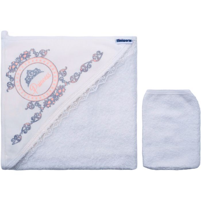 - Замечательное мягкое махровое полотенце после купания с уголком для головки ребенка от турецкого производителя «Miniworld» для маленькой принцессы.