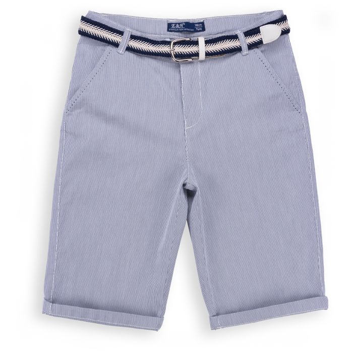 Стильные, светлые, элегантные шорты-бермуды покроя «5 карманов» в мелкую синюю полоску для юного джентльмена. Удобная стандартная посадка. Застёгиваются на пуговицу и прочную металическую молнию с фиксатором. Спереди – 2 прорезных кармана, а сзади – 2 врезных с листочкой. Внутри на поясе по бокам вшита резинка с пуговицей для регулировки объёма талии, что обеспечит максимальный уют и комфорт. Укомплектованы классным плетёным ремнём.