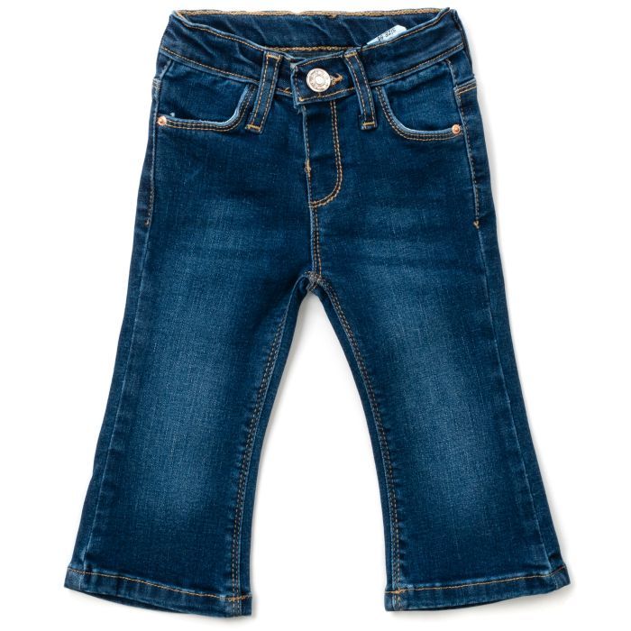 Джинсы имеют классический дизайн, немного расклешенный вниз покрой и высокую посадку. Для удобства ребенка застёжка «молния» отсутствует, есть только пуговица. Без проблем сможете надеть джинсы на подгузник.