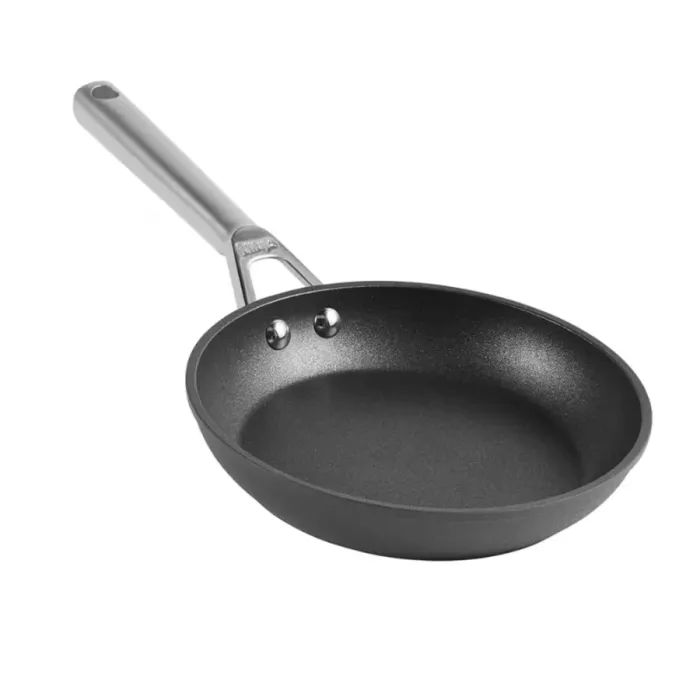Надежность в каждой детали. Прочный кованый алюминиевый корпус сковороды с многослойным дном обеспечивает равномерное распределение тепла, что позволяет идеально готовить блюда при высоких температурах. Ее износостойкое твердоанодированное покрытие дарит возможность использовать металлические кухонные принадлежности без страха повредить поверхность. Литые ручки из нержавеющей стали не только обеспечивают удобный и эргономичный хват, но и подчеркивают премиум-сегмент этой посуды. Ручки крепко закреплены клепочными соединениями и имеют отверстие для подвеса, что упрощает хранение и использование.