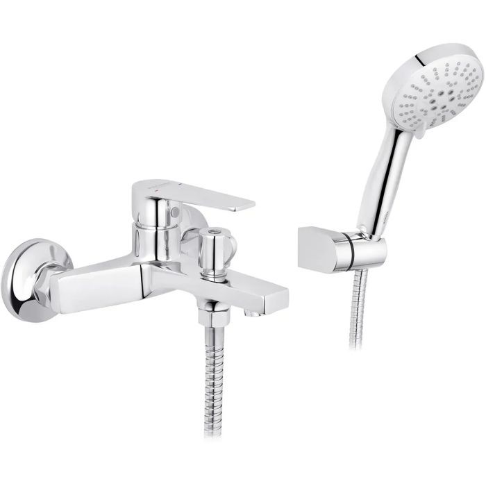 Смеситель комплектуется душевым гарнитуром в составе однорежимной, круглой ручной лейки диаметром 10 см, настенного держателя для ручной лейки, и душевого шланга в металлической оплетке длиной 150 см.