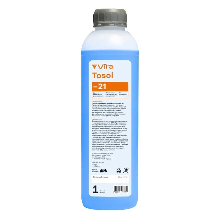 Охлаждающая жидкость VIRA Tosol -21 С предназначена для системы охлаждения двигателя внутреннего сгорания транспортного средства или автономного оборудования. В состав входят специальные антикоррозионные ингибиторы и компоненты, обеспечивающие средство совместимости с металлом, резиной и пластиком.