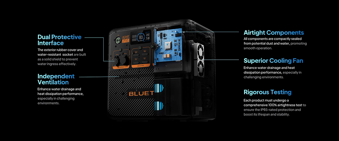 Удобная внешняя конструкция и защита от воды и пыли IP65 обеспечивают устойчивость к дождю, грязи, пыли и солевой коррозии. В сочетании с оптимальной вентиляцией для защиты внутренних компонентов AC240P – это ваш мощный друг, с которым вы можете трогаться куда угодно и делать что угодно!