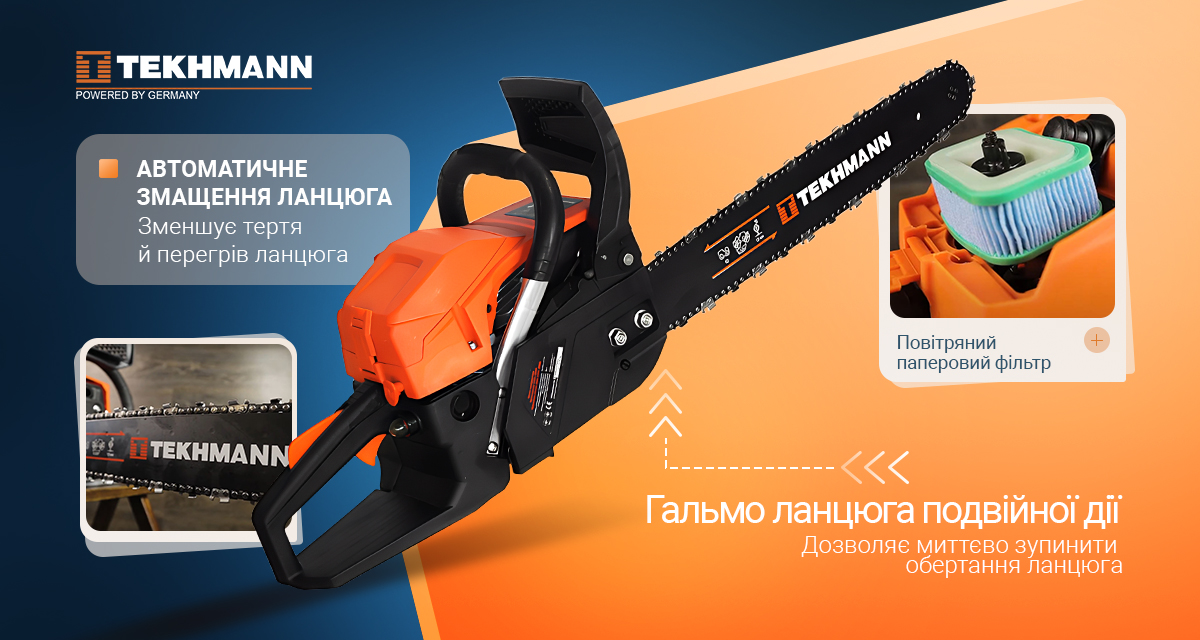 Пила оснащена праймером для швидкого запуску, автоматичним змащенням ланцюга, а також гальмом ланцюга подвійної дії, яке миттєво зупиняє рух у випадку небезпеки. Ефективний повітряний гофрований фільтр забезпечує чистоту повітря для мотора, зменшуючи зношування.