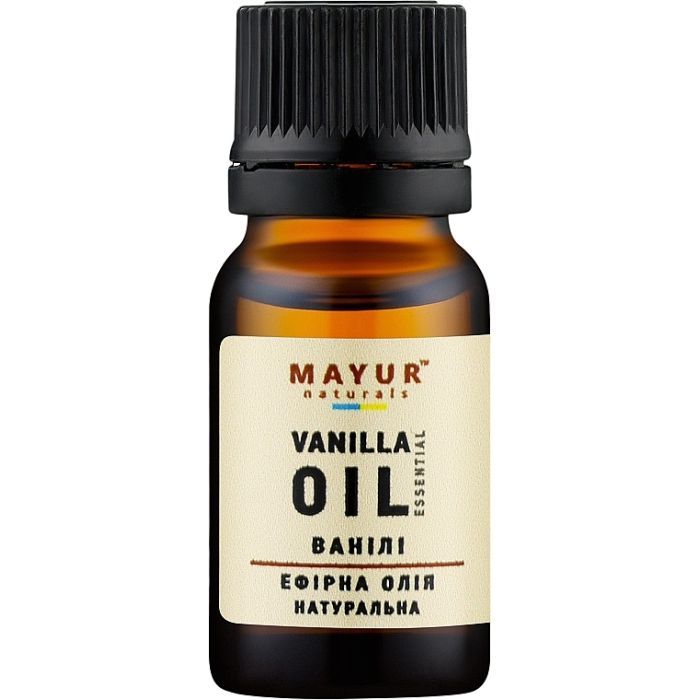 Натуральна ефірна олія ванілі від бренда Mayur має безліч корисних косметичних і ароматичних властивостей. Це природний антисептик, який справляє на організм людини розслаблювальну, протизапальну, болезаспокійливу, антидепресивну й седативну дію. Теплий солодкий аромат допомагає подолати стрес, зняти емоційну напругу. Він допомагає налаштуватися на позитивне мислення, забезпечує відчуття захищеності й душевного тепла, підвищує впевненість у власних силах і працездатність, а також доглядає шкіру.