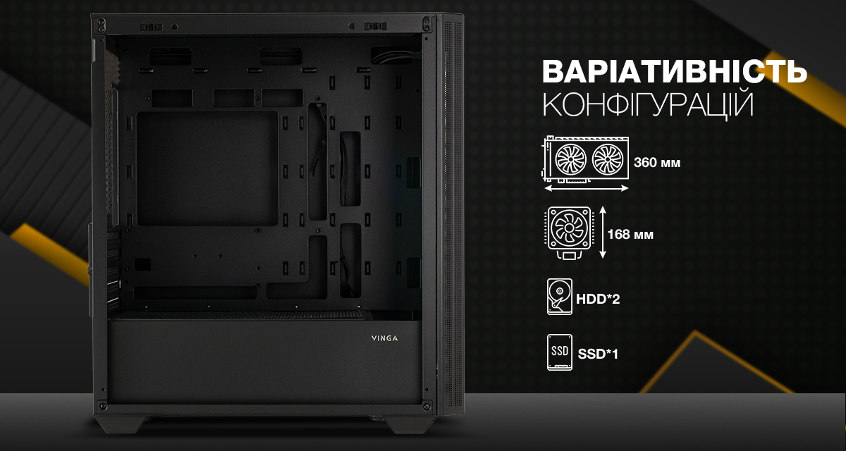 Vinga Cello надає доволі широкі можливості для установки різноманітних компонентів. Зручність монтажу відеокарт довжиною до 360 мм і процесорного кулера з висотою до 168 мм робить цей корпус ідеальним вибором для ентузіастів комп'ютерних конфігурацій. Корпус має 2 внутрішні відсіки для 3,5-дюймових жорстких дисків і 1 відсік для 2,5-дюймових SSD-дисків, що забезпечує достатньо місця для зберігання даних.